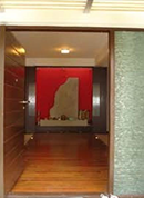 Rustic pooja area with a stone sculpture and backdrop.